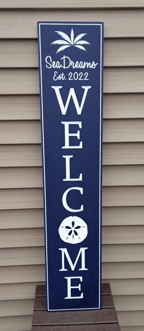 Welcome guests in seaside style with this Beach House Vertical Welcome Sign — a handcrafted vertical sign made to bring charm and character to your beach house, lake cabin, coastal cottage, or oceanfront rental. Designed for year-round outdoor use, each sign is precision-carved from durable 3/4-inch weatherproof PVC and finished with care to withstand sun, wind, rain, and salt air.