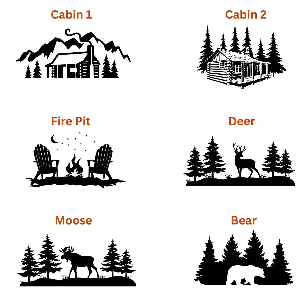 | Cabin Artwork | Cabin 1, Cabin 2, Fire Pit, Deer, Moose, Bear, Other Requested Artwork |