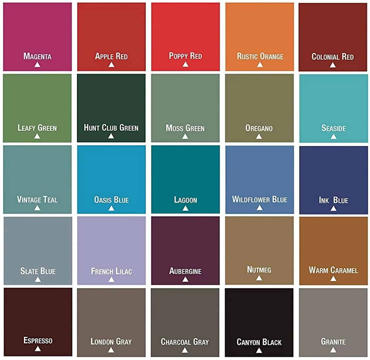 | Color | Apple Red, Aubergine, Canyon Black, Charcoal Gray, Colonial Red, Espresso, French Lilac, Granite, Hunt Club Green, Ink Blue, Leafy Green, Lagoon, London Gray, Magenta, Moss Green, Nutmeg, Oasis Blue, Oregano, Poppy Red, Rustic Orange, Seaside, Slate Blue, Vintage Teal, Warm Caramel, Wildflower Blue |