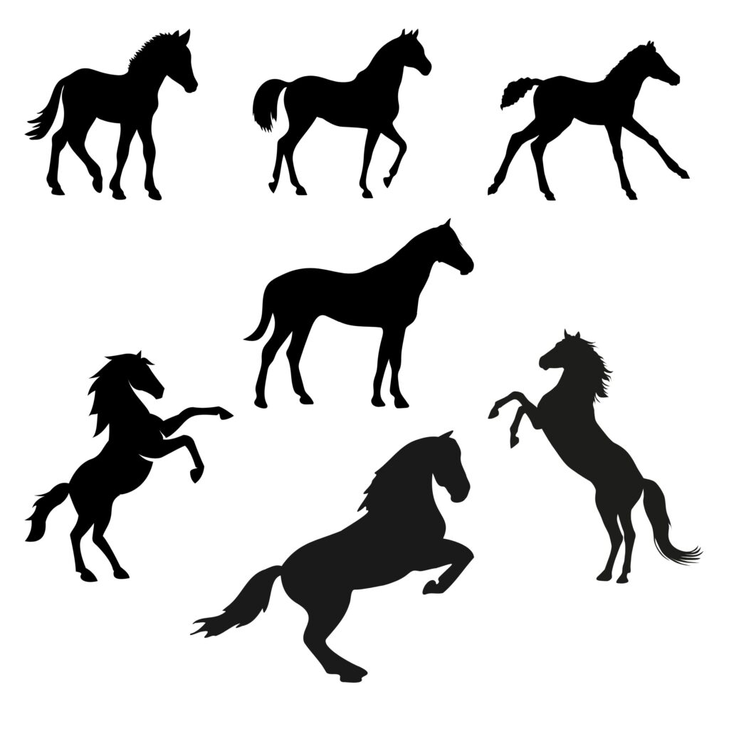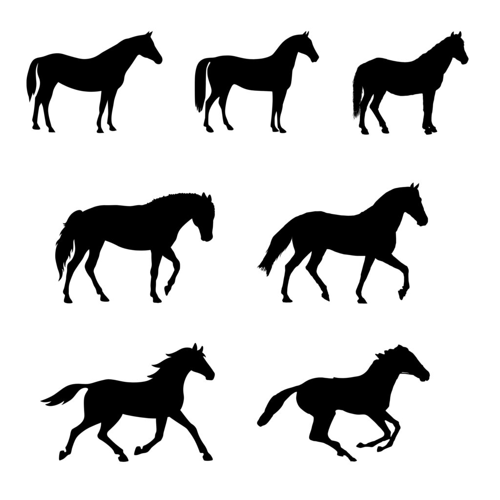 Silhouettes of seven horses in various poses and gaits including standing walking trotting and galloping are displayed in black on a white background as sample design elements