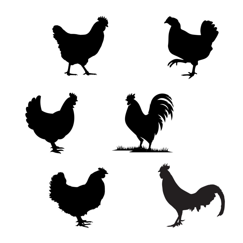 Six black silhouettes of chickens and roosters in various poses on a white background ideal as sample design elements with one rooster standing on grass and the others walking or standing on flat ground