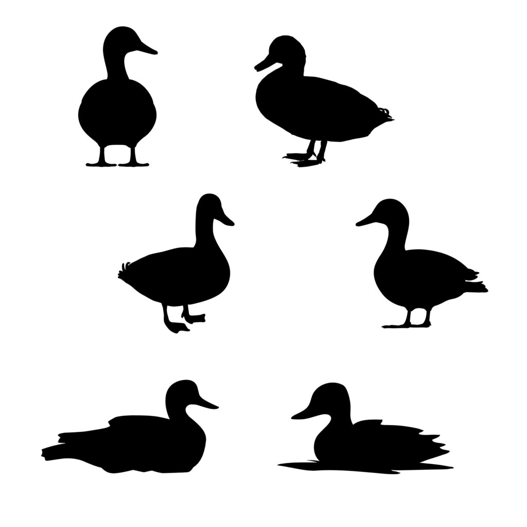 Six black duck silhouettes in various standing and swimming poses are arranged on a white background These sample design elements feature ducks facing both left and right with two appearing to float on water