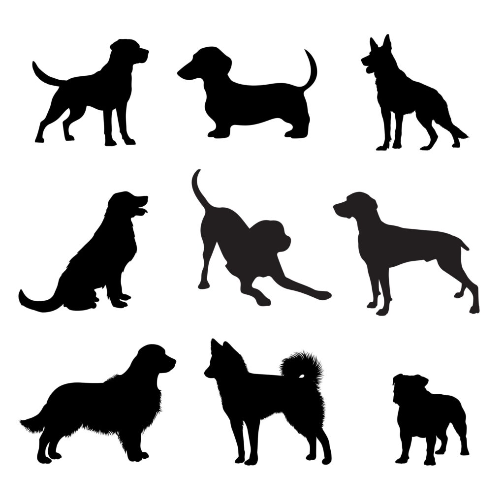 A collection of nine black dog silhouettes each showcasing a different breed and posture arranged in three rows against a white backgroundperfect as stylish design elements for your next sample design project