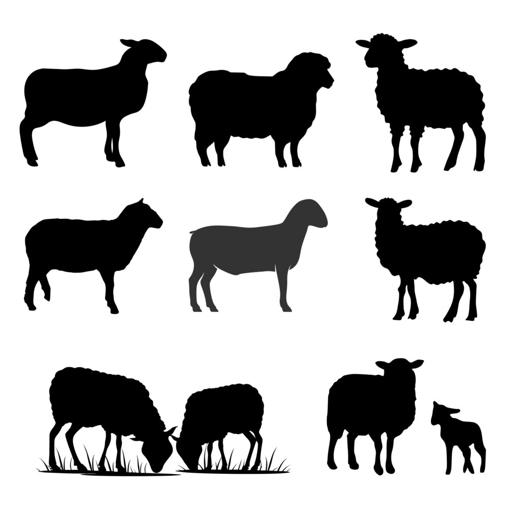 Silhouettes of eight sheep in different poses including pairs grazing standing sheep and one lamball in black on a white backgroundperfect as sample design elements for creative projects