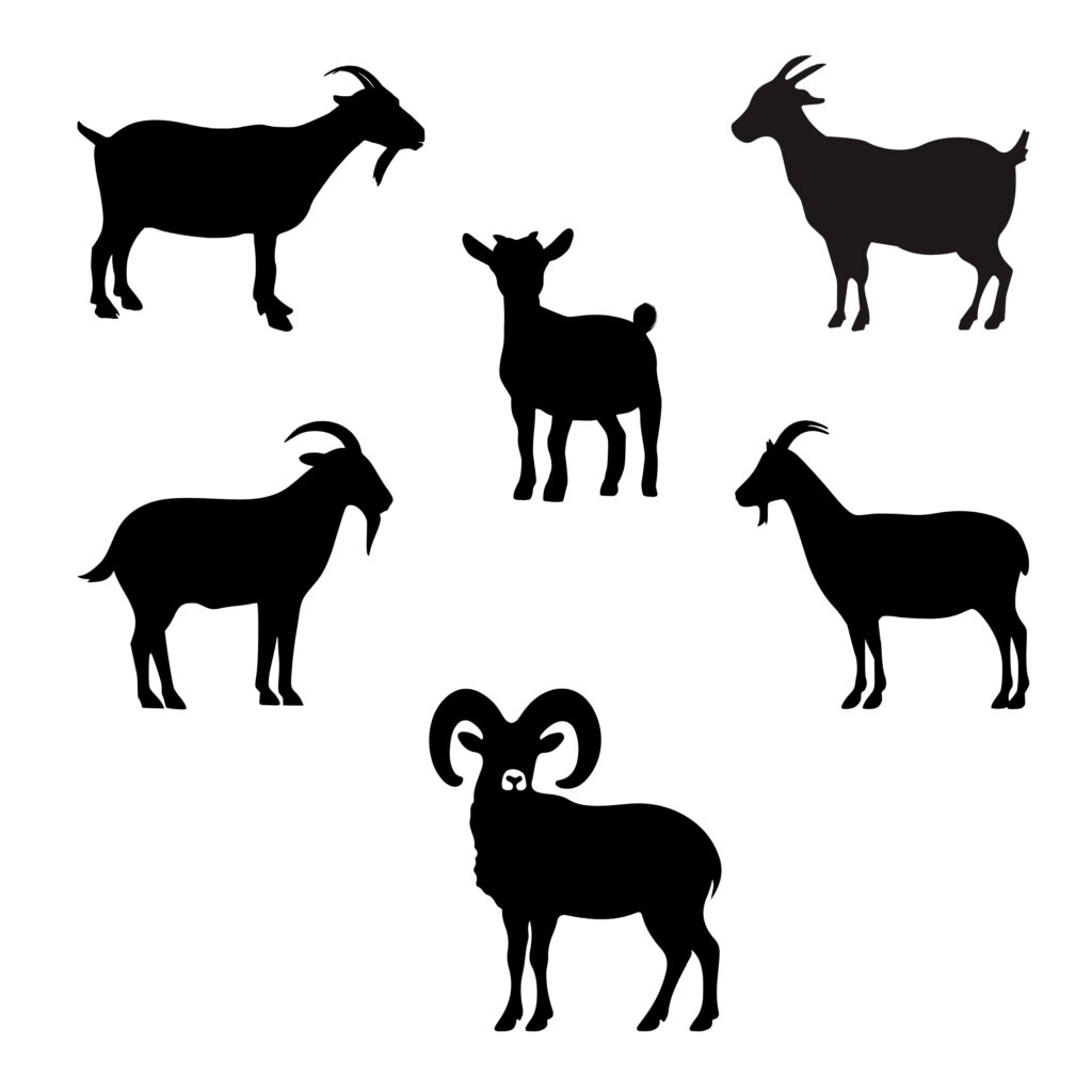 Silhouettes of five goats including one with large curved horns form a circle on a white background Each goats distinct stance and horn shape adds unique design elements to this sample design