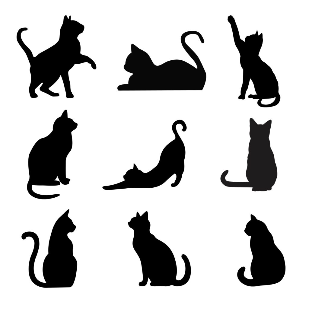 Nine black cat silhouettes in various posesincluding sitting stretching and reaching upwardare arranged in a three by three grid on a white background making them perfect sample design elements for creative projects