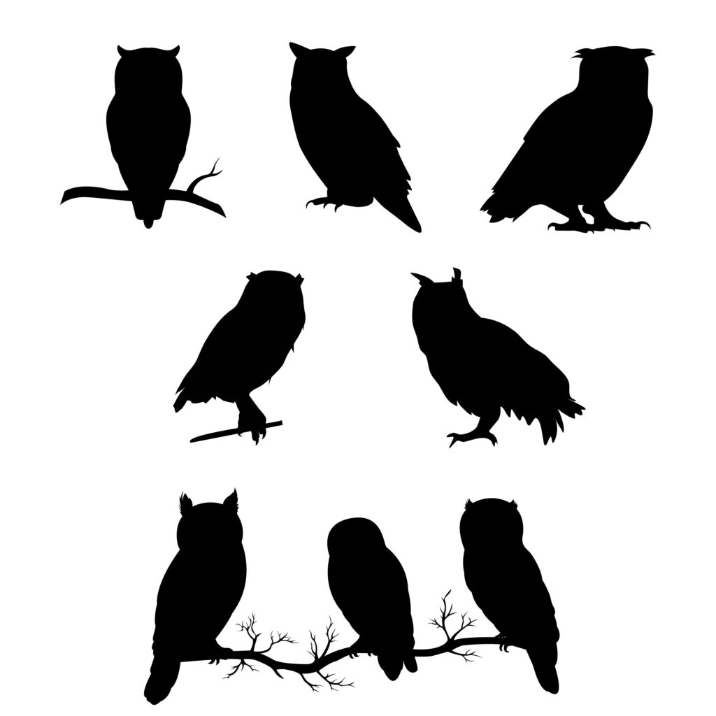 Seven different owl silhouettes perched on branches each in a distinct pose serve as unique sample design elements The owls vary in size and feather shapes with some having visible ear tufts and others rounded heads against a white background
