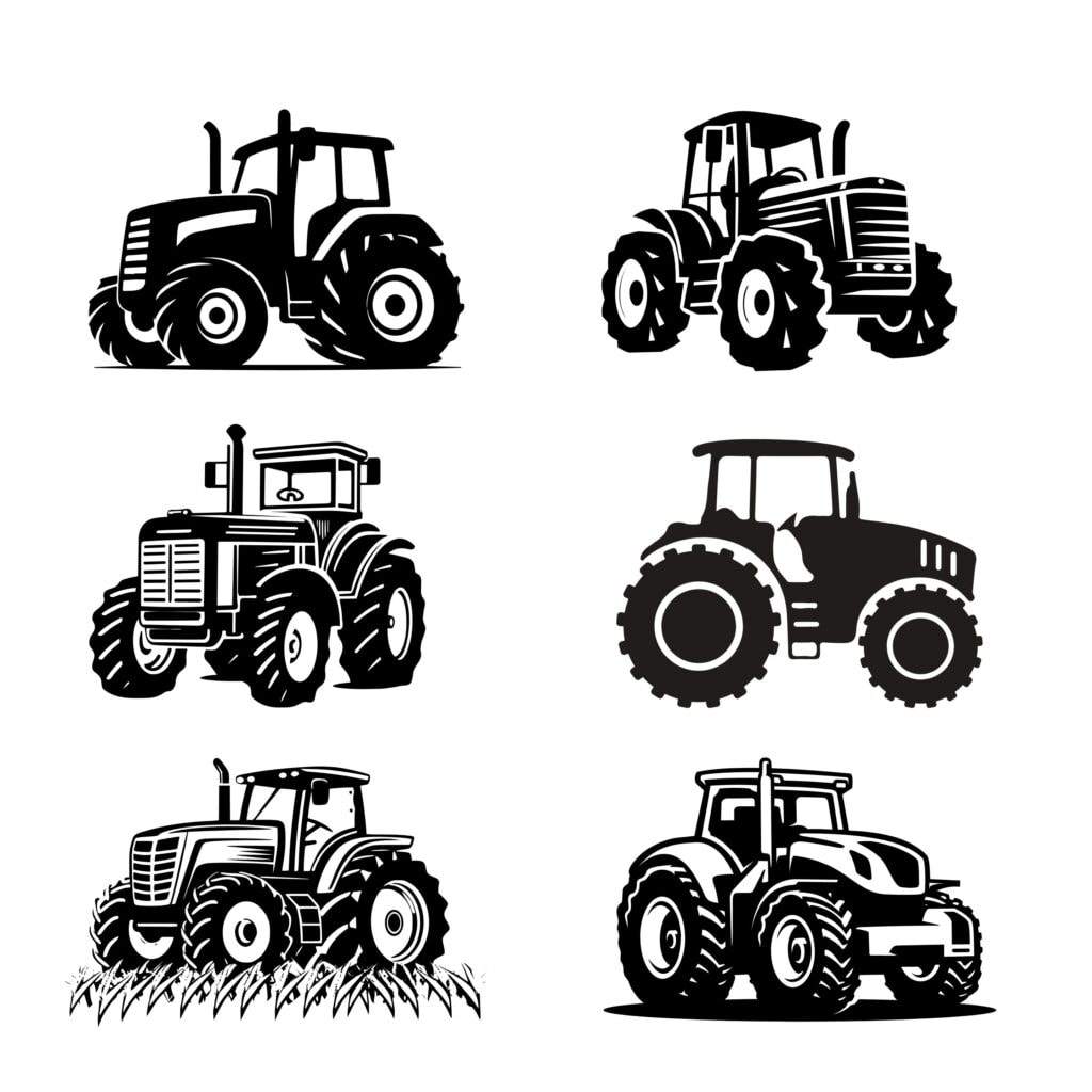 Six black and white illustrations of tractors with unique sample design elements and details including one driving through grass are arranged in two columns of three on a white background