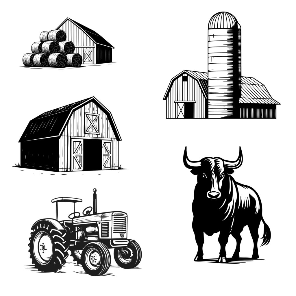 Black and white illustrations feature sample design elements a barn with hay bales a barn with a silo a standalone barn a tractor and a bulleach depicted separately on a white background