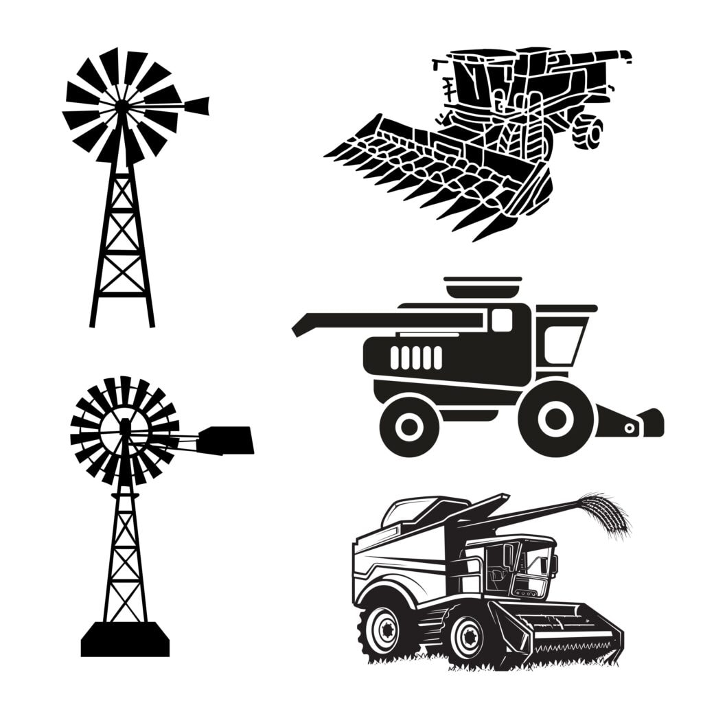 Four black and white illustrations feature sample design elements two windmills on the left one with blades forward one to the side and two combine harvesters on the rightone simple one with detailed grain discharge