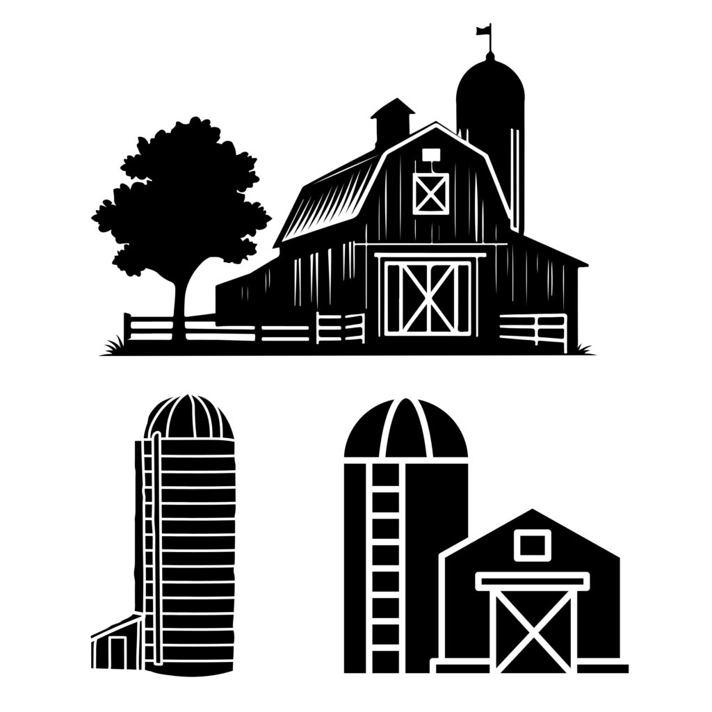 Black and white illustrations of barns and silos feature sample design elements the top image shows a barn with a tree and fence while the bottom images display two different barns with large silos beside them