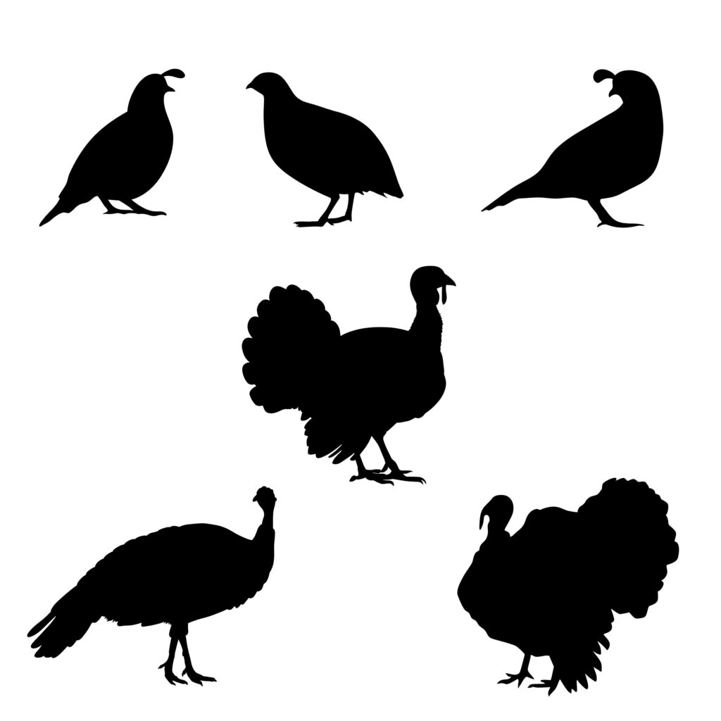 Silhouettes of three quails in different poses on the top row and three turkeys in various stances on the bottom row all against a white backgroundperfect sample design elements for your creative projects