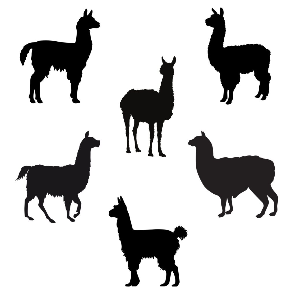Six black llama silhouettes facing different directions each with unique fur textures and poses serve as versatile sample design elements on a plain white background