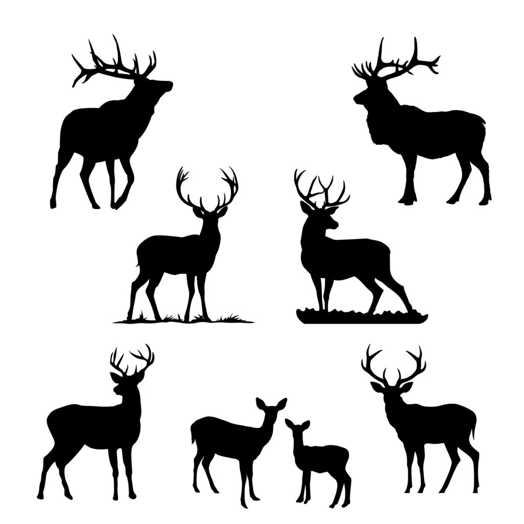 Silhouettes of various deer and elk in different poses including standing grazing and two fawns with their mother arranged on a white backgroundperfect sample design elements for your creative projects