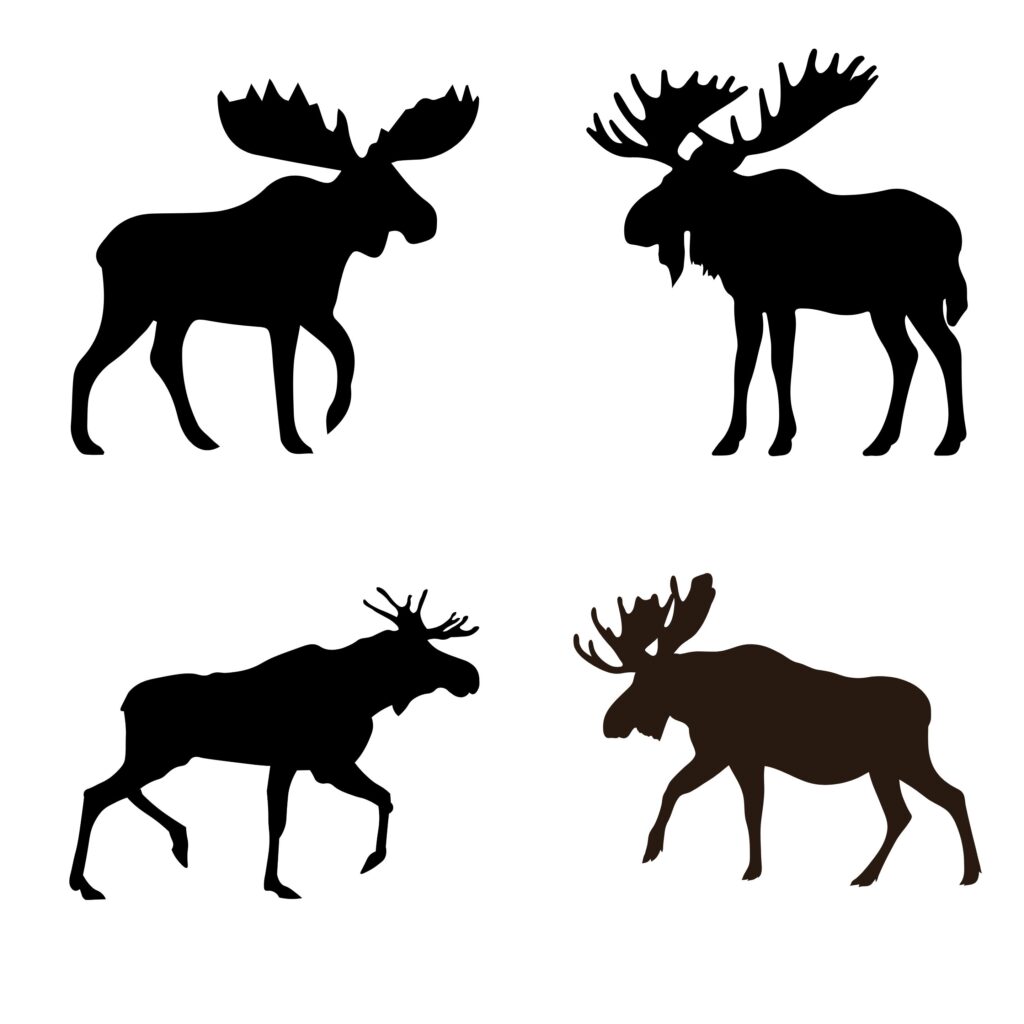 Four silhouettes of moose in different poses and styles are arranged in a two by two grid on a white background serving as unique sample design elements Each moose features distinctive large antlers and is shown in profile