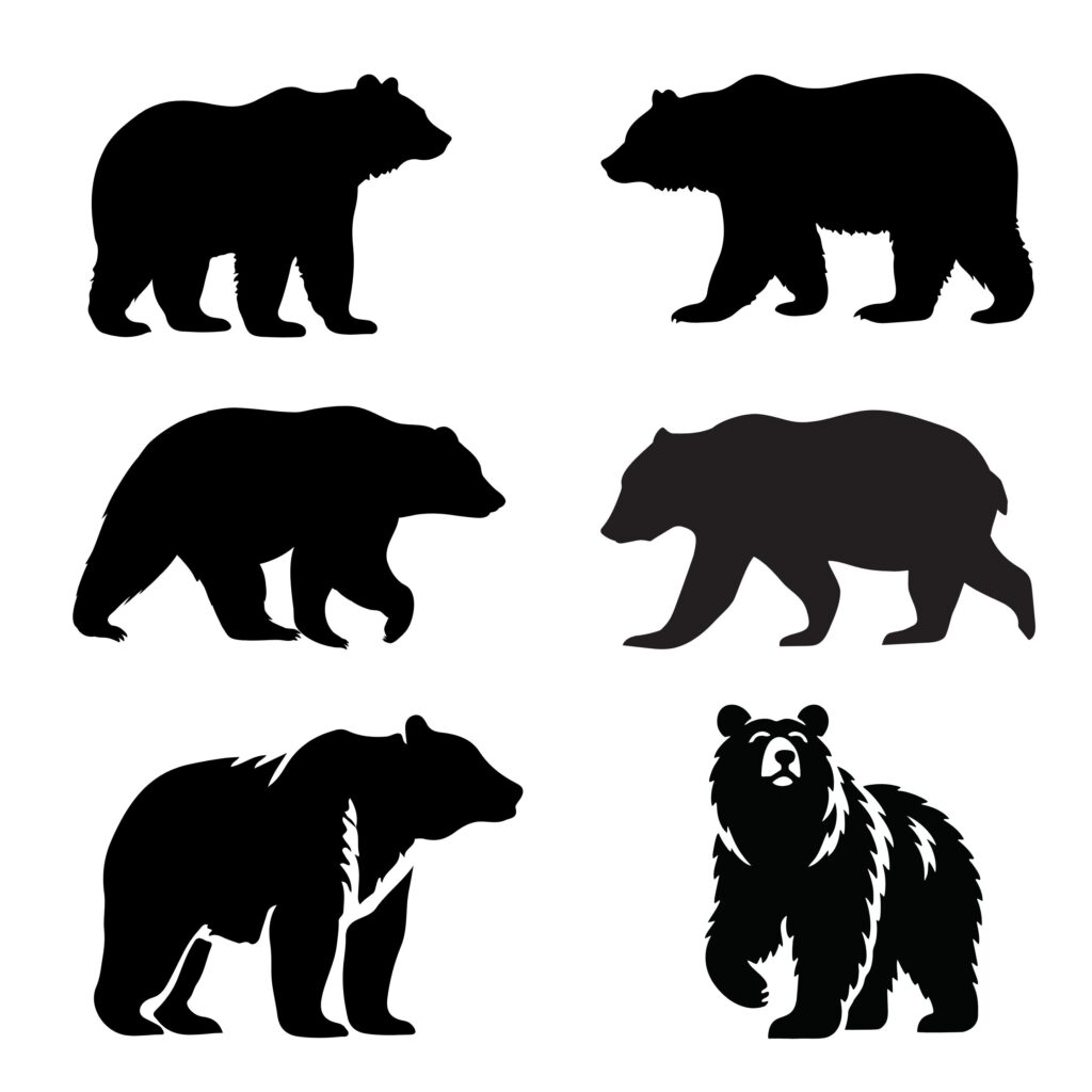 Six black bear silhouettes are shown in different poses including walking standing and facing forward These sample design elements are set on a white background with slight variations in shape and posture among each silhouette