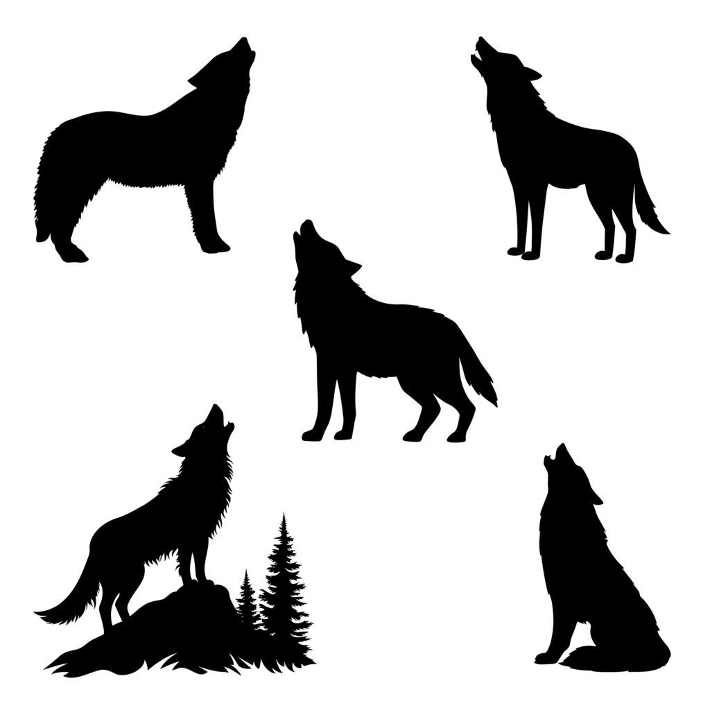 Five black wolf silhouettes howling in different poses including one standing on a hill with pine trees and another sitting all against a white backgroundperfect design elements for any sample design