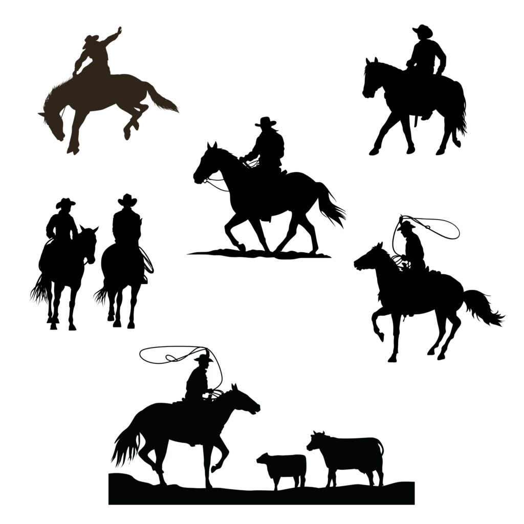 Silhouettes of cowboys riding horses some roping and herding cattle in various dynamic posesthese sample design elements illustrate typical western cowboy activities