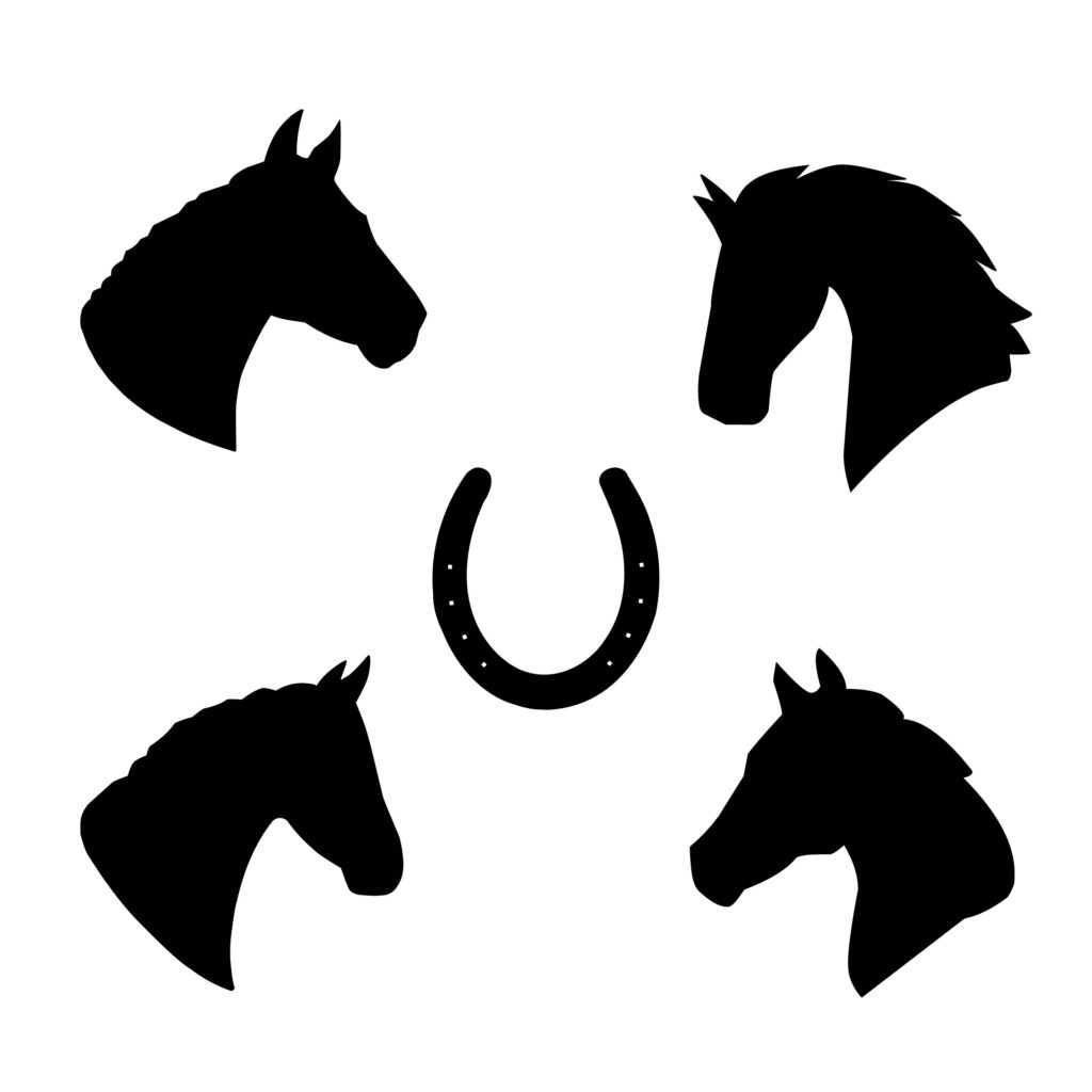 Four black horse head silhouettes arranged in a circle around a central horseshoe all on a white background Ideal for showcasing sample design elements in equestrian themed graphics or logos