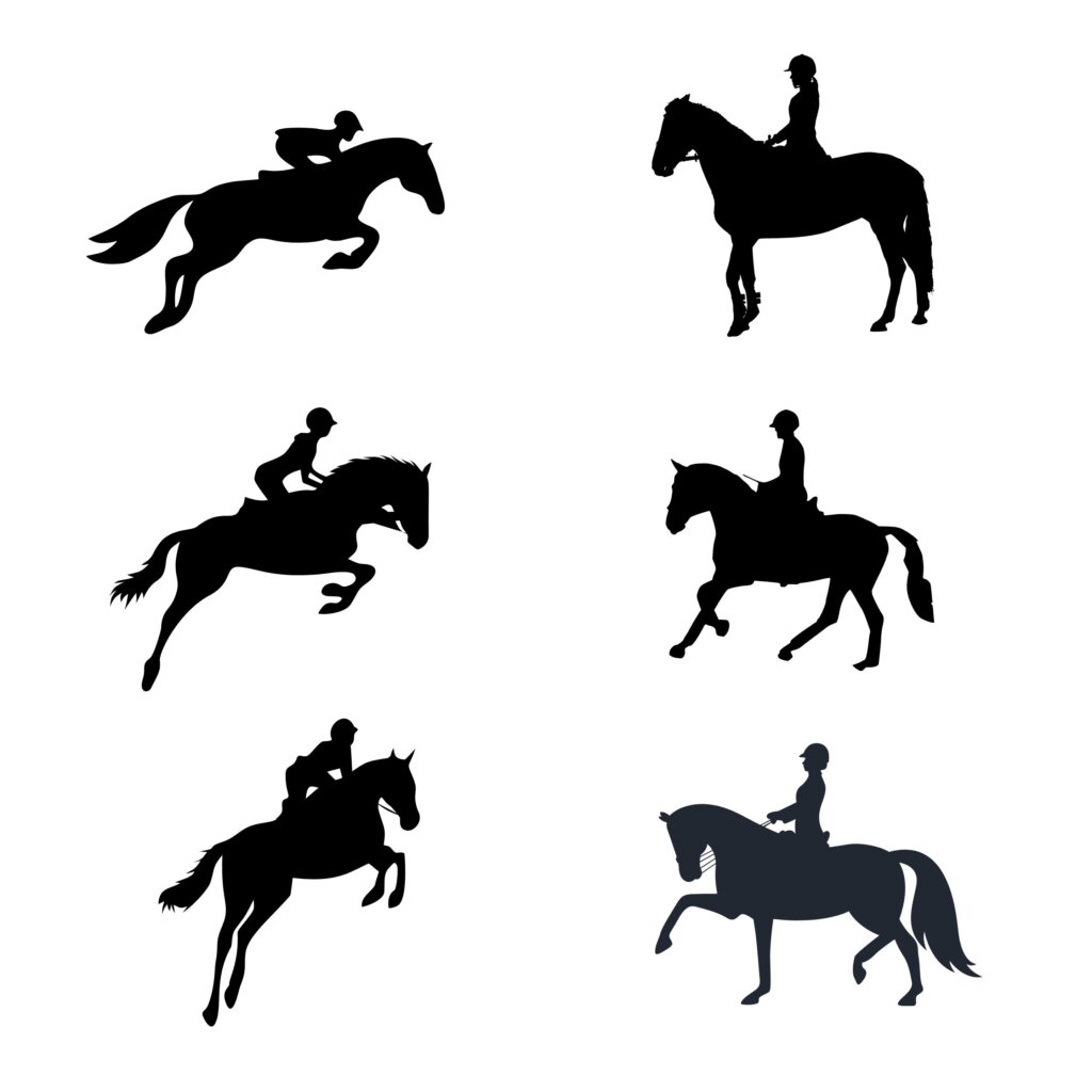 Six black silhouettes of equestrians riding horses three show riders jumping obstacles and three sit upright on walking or trotting horses These sample design elements are all side profiles set against a white background