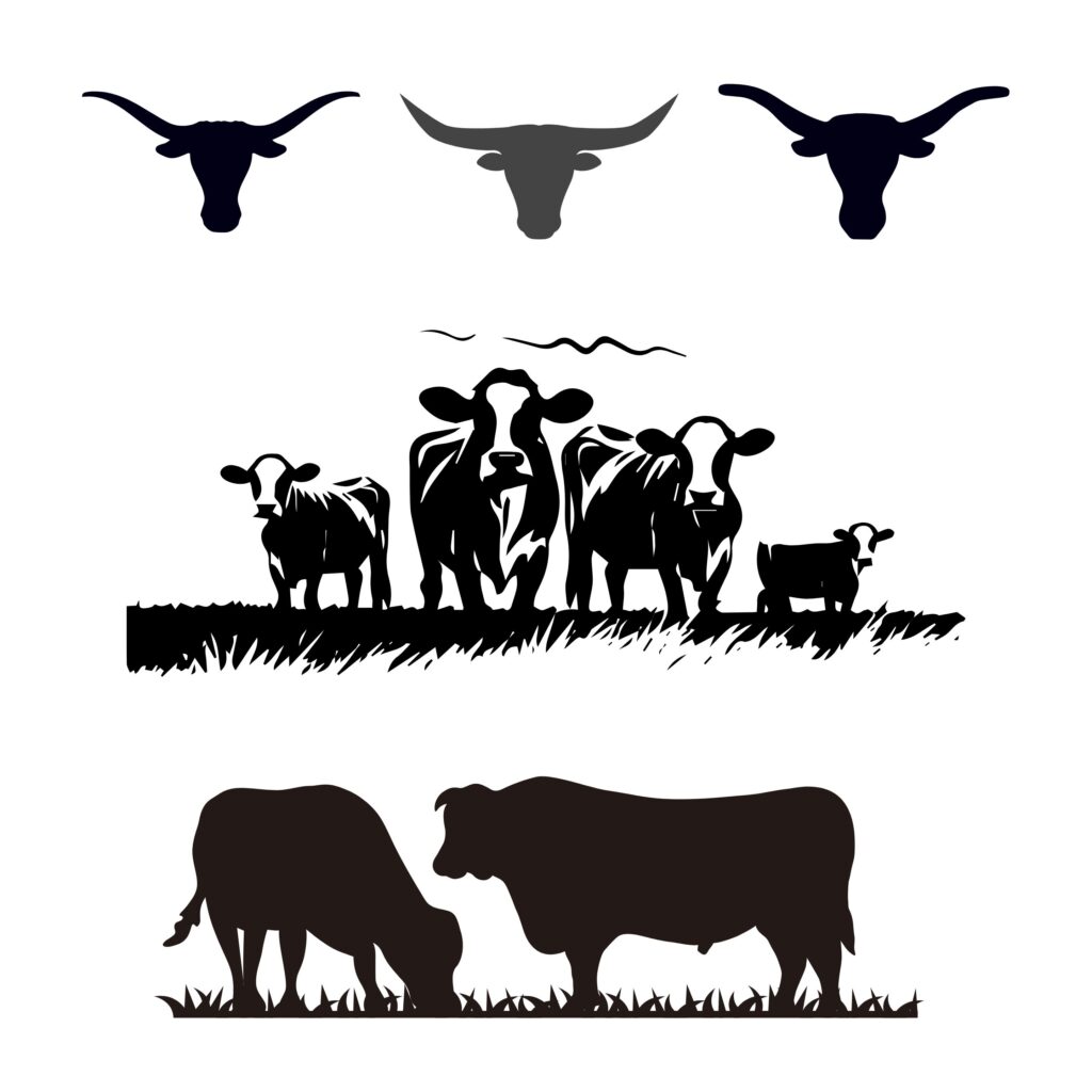 A set of black silhouettes featuring three bull heads a group of cows and calves standing in grass and two cows grazingideal as sample design elements for creative projects