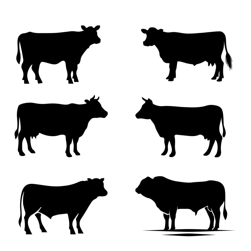 Six black cow silhouettes in various standing poses are displayed on a white background arranged in two rows of three Each cow features distinct horn shapes and body outlines making them ideal sample design elements for creative projects