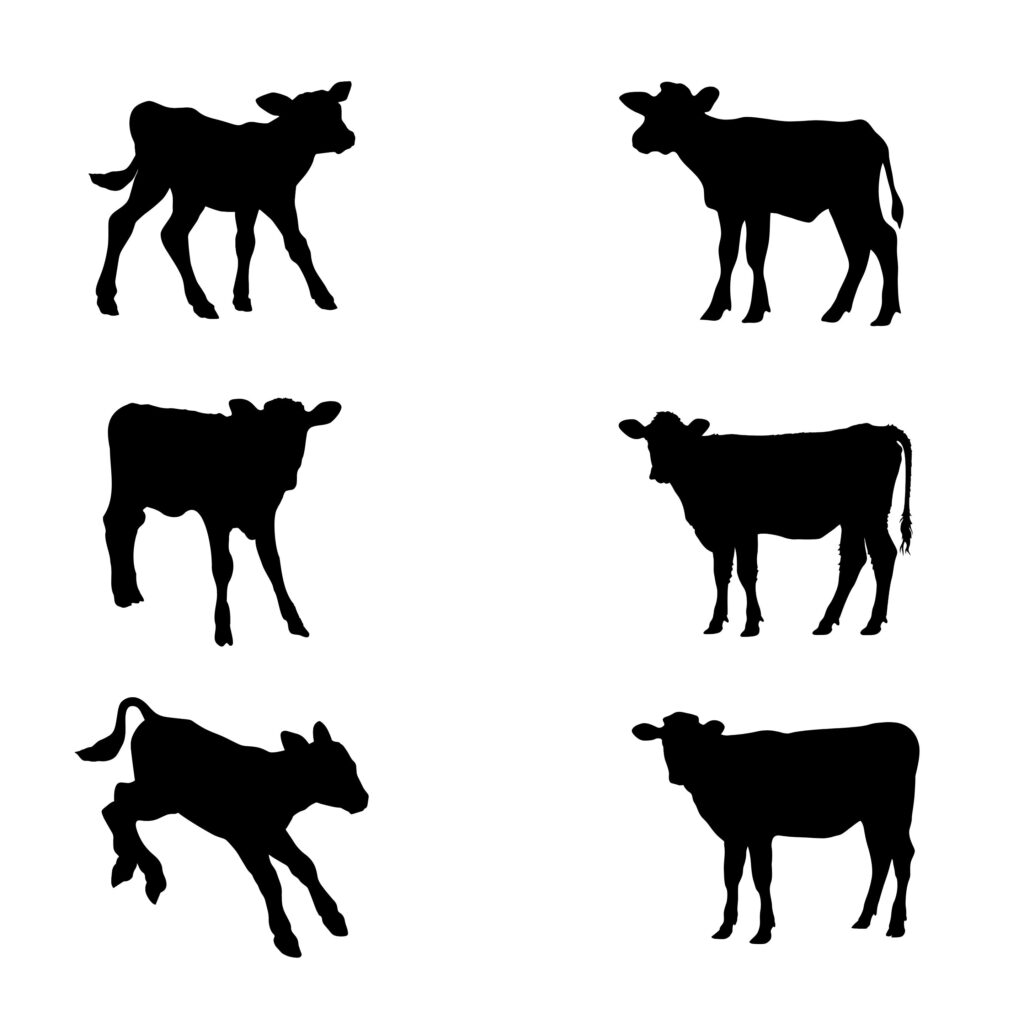 Six black silhouettes of calves in various poses on a white background some are standing some are walking and one is leapingideal as sample design elements for creative projects