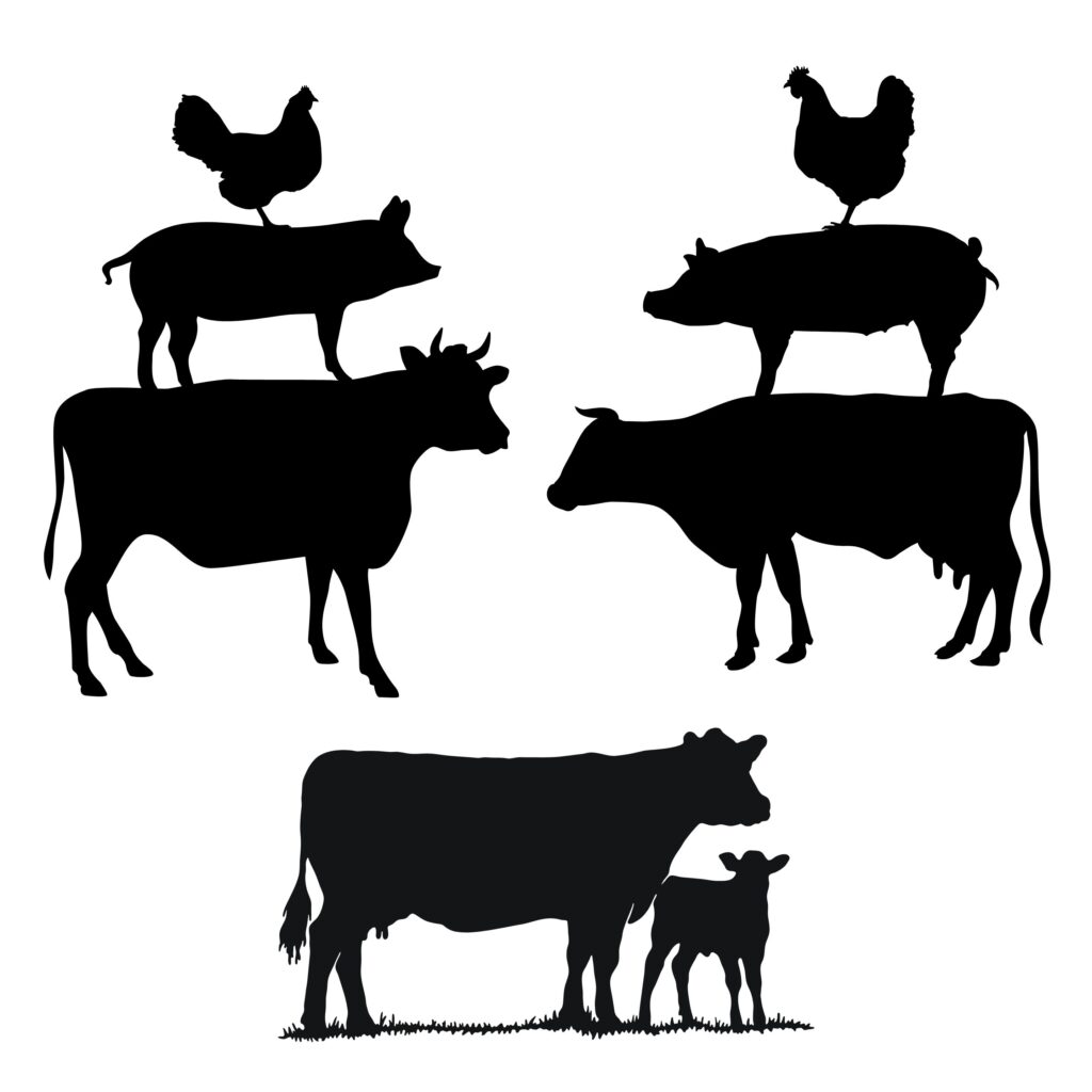 Silhouettes of farm animals stacked on each otherchickens on pigs pigs on cowsstand beside a cow and her calf All are in black on white offering sample design elements perfect for creative projects