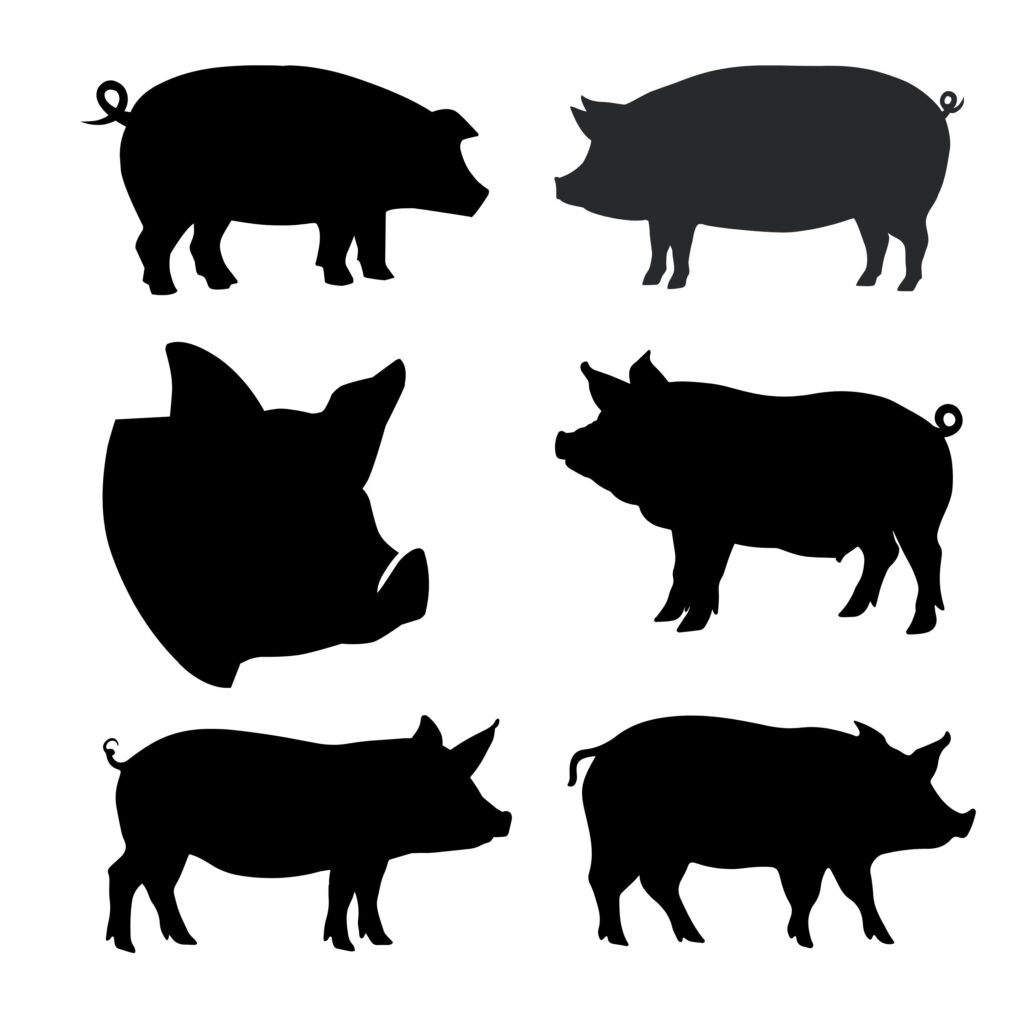 Six black pig silhouettes in different poses and angles on a white background including side front and close up viewsperfect as sample design elements for creative projects
